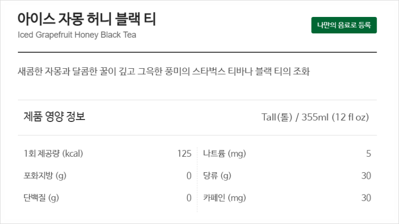 자몽허니블랙티는 Tall기준 125kcal 다른 프라프치노 같은 단 음료들에 비해 굉장히 낮습니당!!