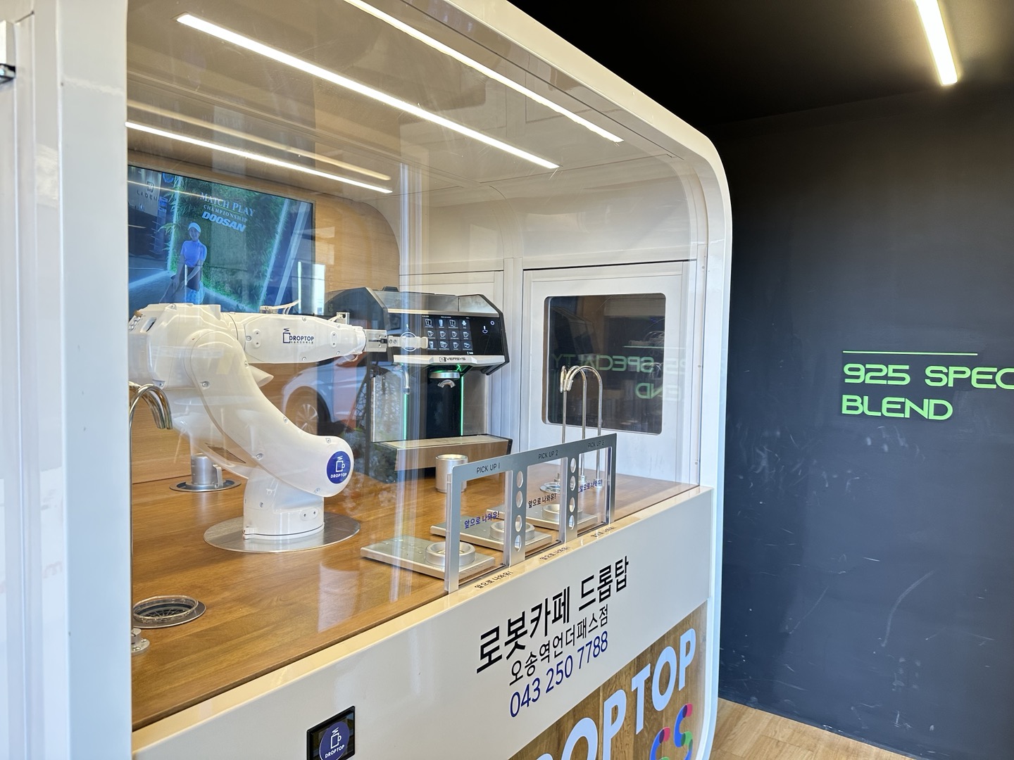 키오스크로 주문을 하면 그 옆에 있는 로봇커피가 움직여 커피를 제조해준다~