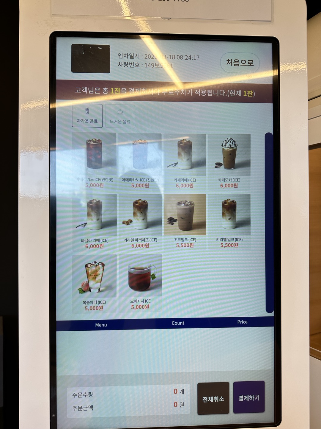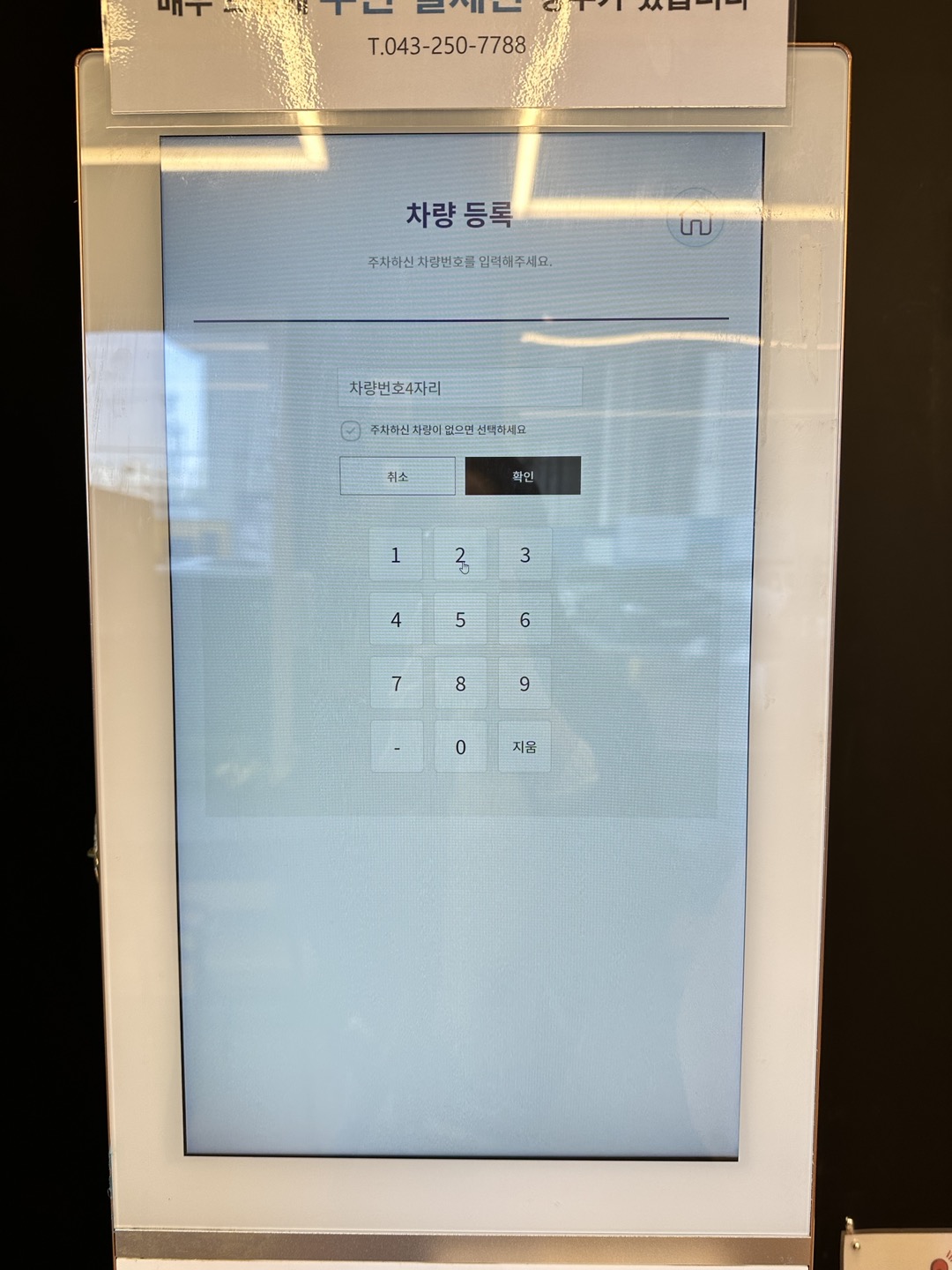 키오스크로 주문을 하기 전에 차량 번호를 등록하라고 화면이 뜨는데, 요기에 차번호를 입력하면 자동으로 정산이 되는 시스템이다! 그래서 따로 정산이 필요없어서 아주 편하다