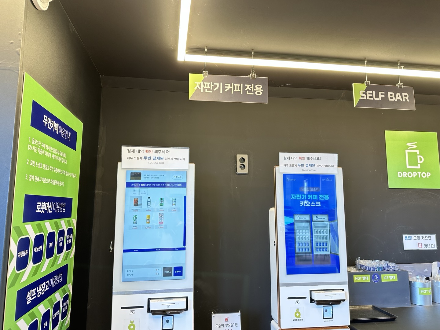 들어서자마자 키오스크 여러개가 있고, 오른편이 캔음료, 왼편이 로봇커피를 주문하는 키오스크이다.