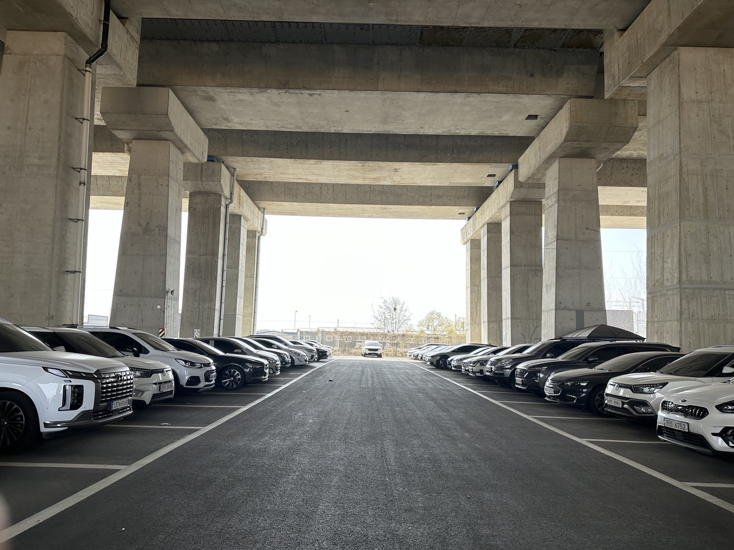 정말 넓다~ 주차공간이 넉넉하다는 것이 큰 장점! 더불에 철도길 하부에 있어서 지붕이 있다!!