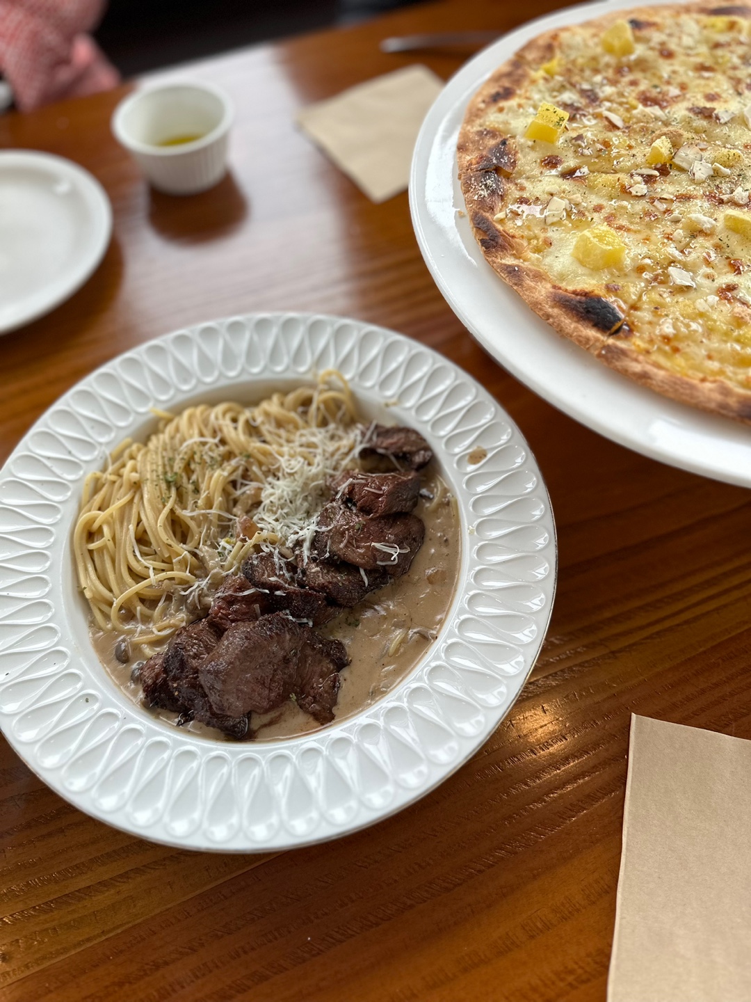 메뉴는 샐러드/고구마피자/부채살크림스파게티/감자튀김을 시켰는데 너무 맛있도라,,,