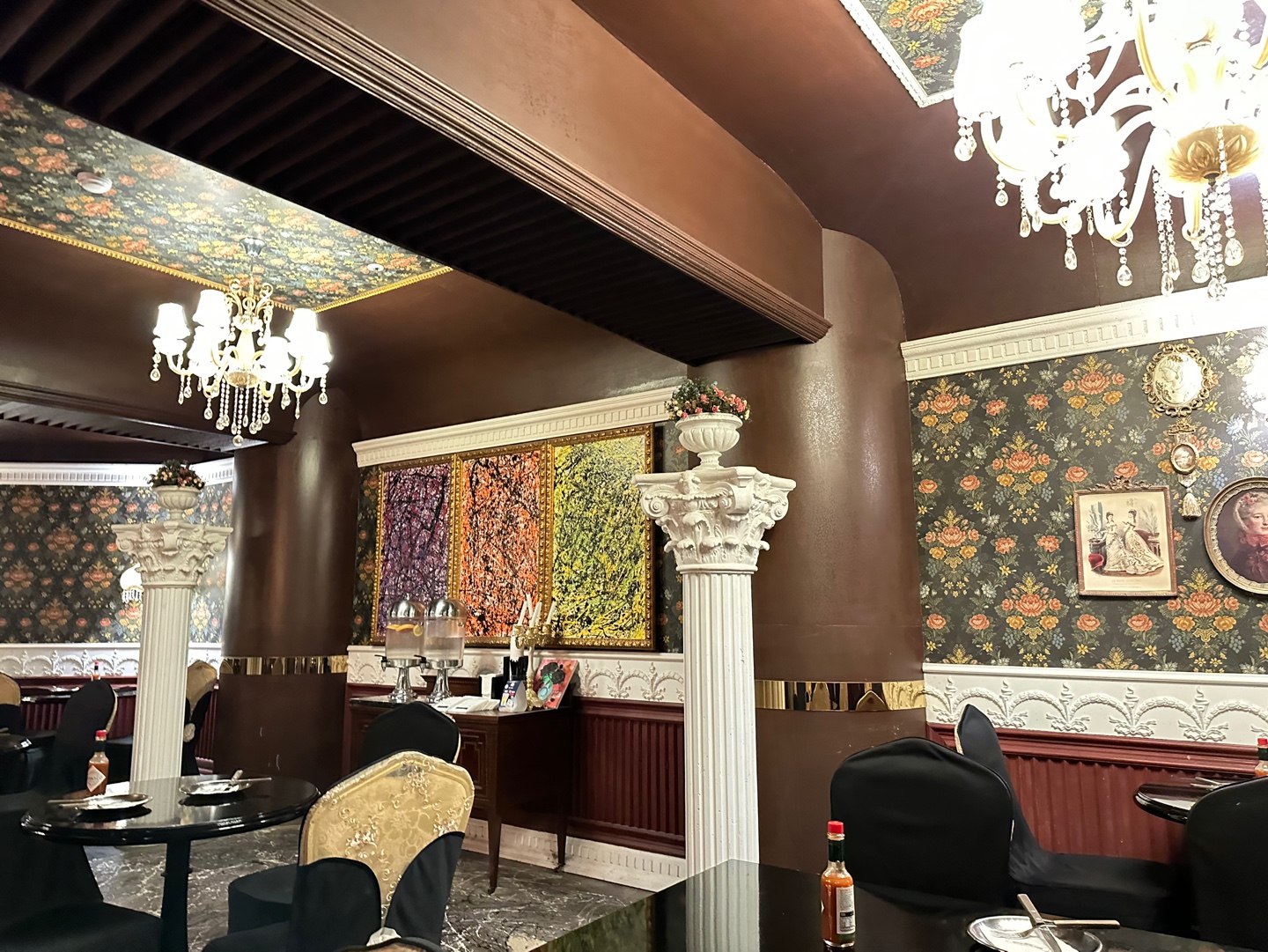 천장에 샹들리에도 엄청 많이 달려있고 벽지도 알록달록하다