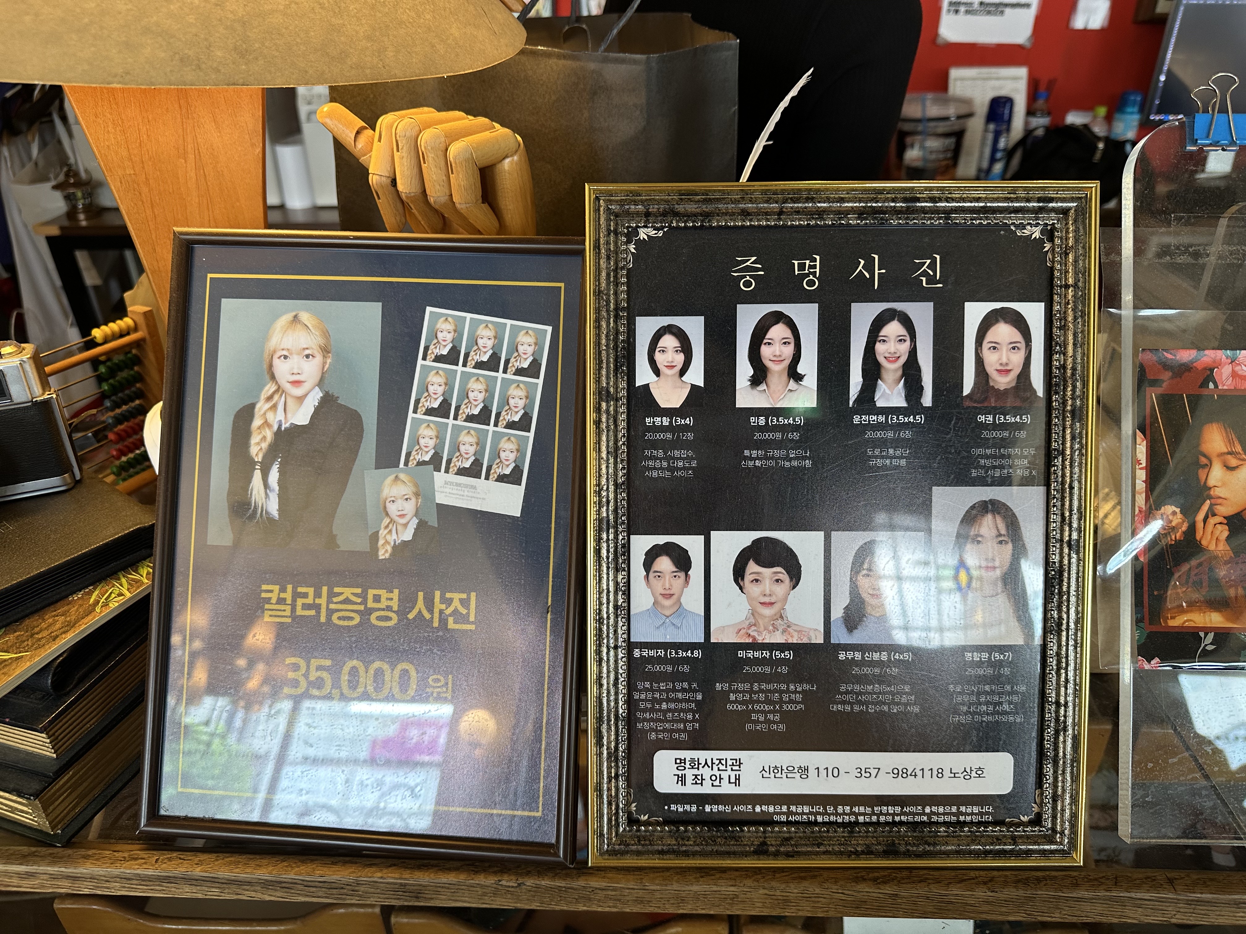 30분 후에 다시 명화사진관으로! 증명사진은 20,000원이고 컬러증명사진은 35,000원이다.